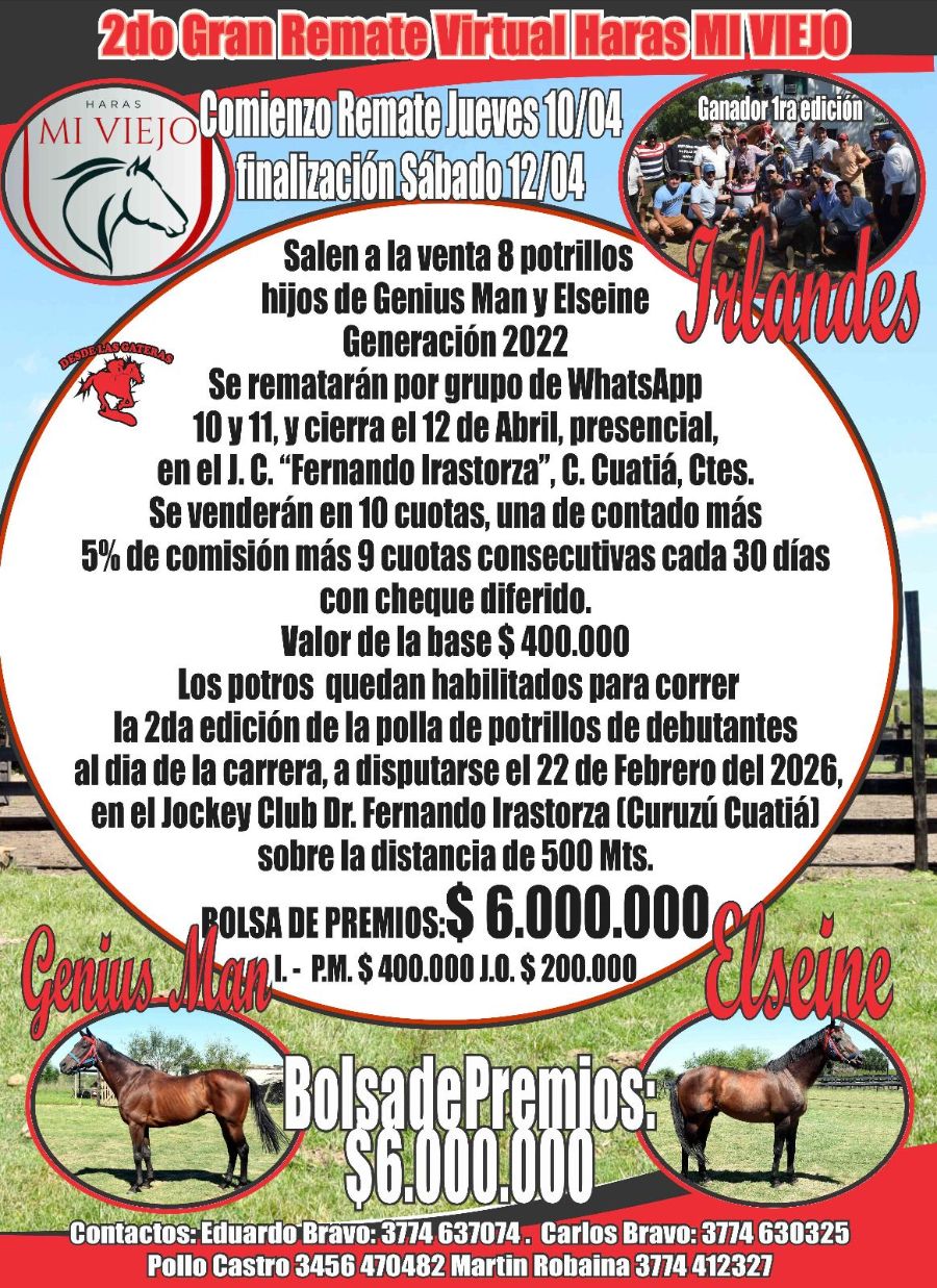 2DO GRAN REMATE DE HARAS MI VIEJO – 10, 11 Y 12 DE ABRIL 2025 Mar 29, 2025 | REMATES 2do GRAN REMATE HARAS MI VIEJO 10. 11 y 12 de ABRIL Por grupo cerrado de WhatsApp y presencial en el J. C. Dr. FERNANDO IRASTORZA. Aquí fotos y pedigrees 👇👇 Aquí fotos y pedigrees 👇👇 No te pierdas de los remates en este sitio web, en nuestro facebook , y youtube🐎