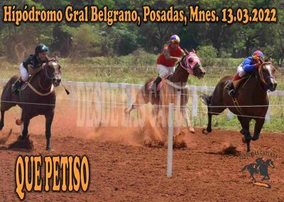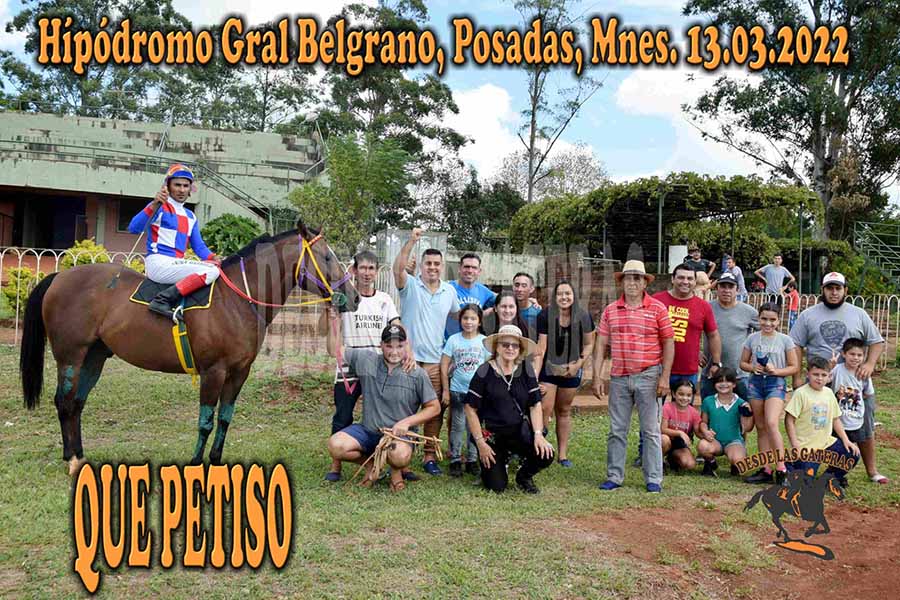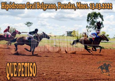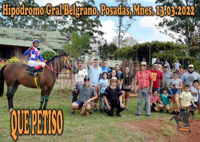 QUE PETISO – HIPODROMO GRAL BELGRANO Posadas, 13.03.2022 Mar 15, 2022 | RESULTADOS 2da Carrera Ganador QUE PETISO de Maidana de Posadas