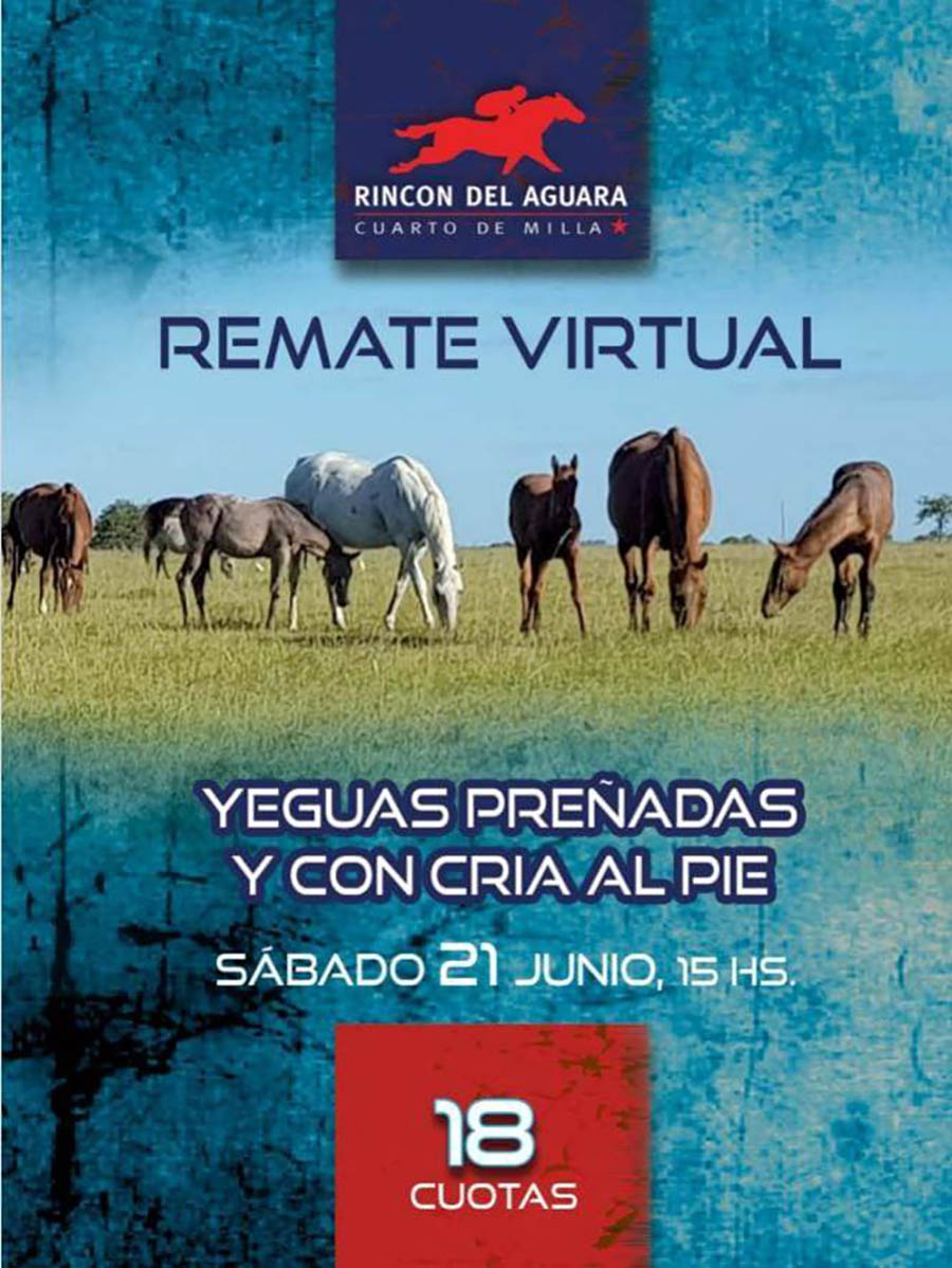 REMATE – RINCÓN DEL AGUARÁ 21 DE JUNIO 2025 Jun 6, 2025 | REMATES REMATE VIRTUAL POR RINCÓN DEL AGUARÁ Se rematan yeguas preñadas y crias al pie, el 21 de Junio a las 15 horas!! Contáctese si está interesado. Ampliar las imágenes abajo👇👇 No te pierdas todo lo nuevo del Turf en este sitio web, en nuestro facebook , y youtube🐎
