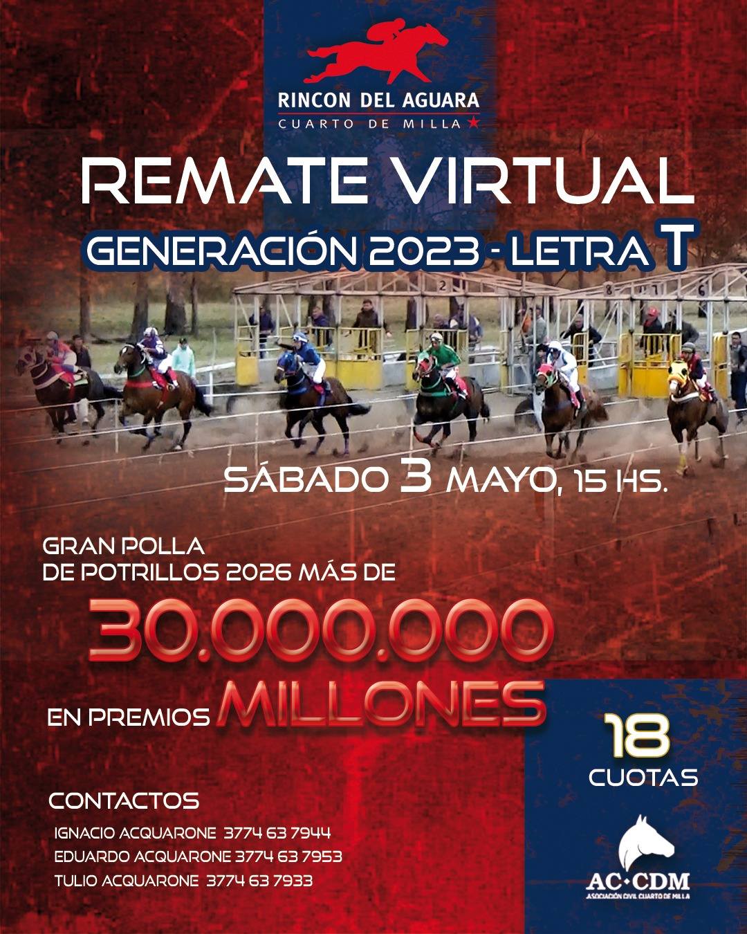 REMATE RINCÓN DEL AGUARA GENERACIÓN 2023 LETRA T – 3 DE MAYO 2025 Abr 20, 2025 | REMATES REMATE VIRTUAL, RINCÓN DEL AGUARA GENERACIÓN 2023 LETRA T, 3 DE MAYO 2025 Y ya los tenés a tu disposición!!! Ampliar las imágenes abajo 👇👇 No te pierdas todo lo nuevo del Turf en este sitio web, en nuestro facebook , y youtube🐎